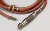 About MeLength of coiled orange rubber hose with fittings and Bon Accord Pneumatic Tool Company tool holder.The hose is clipped at both ends to a connector, with the tool holder screwed to the connector at one end whilst the other connector has a bayonet fitting. The hose is in two parts, connected in the middle to a brass tap.