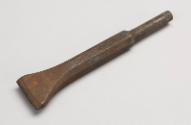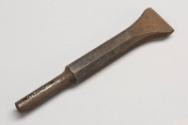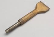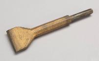 The branded chisel has an applied gold finish (unidentified) and may be made entirely from tungsten. The blacksmith chisel has a tungsten tip inserted into a steel body. There's some evidence it originally had an applied black finish (unidentified) and there is a thin layer of rust to the tool, particularly near the cutting edge and on the shank.