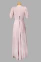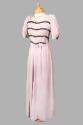About MeLilac moss crepe full-length evening dress with a flared skirt and fitted bodice featuring short puffed sleeves and padded shoulders. A small amount of glamour has been added to the plain fabric with rows of sequin and bead decoration. Many war-time fabric dyes were prone to fade over time, which is illustrated by this dress that has faded to a dull grey in places.1940s