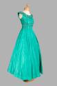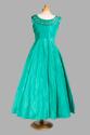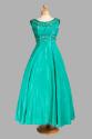 About MeLong green 1950s taffeta evening dress with a boned bodice and stiffened underskirt. This beautiful dress has been decorated with bugle beads, iridescent sequins, and crystals in a floral design on the front of the bodice, with bands of bugle beads around the neckline.