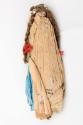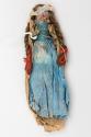 About MePeg doll made from wooden peg, textile wrapped over top of peg to form face with sewn features. Blue crepe dress with a beige crepe cape, long pleated brown hair with red ribbons and crepe headband. Pipe cleaner arms, perhaps Mary from a nativity scene.One of seven dolls from the former Aberdeen Academy, these may be nativity dolls.