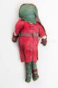 About MePeg doll made from wooden peg, textile wrapped over top of peg to form face with sewn features. Red crepe dress with a brown belt and aluminium buckle. Green crepe legs with red thread wrapped up the legs. Long crepe green hood with red stitching and pipe cleaner arms, covered with textiles. End of arms wrapped in red crepe paper, tied on with thread.One of seven dolls from the former Aberdeen Academy, these may be nativity dolls.