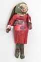 About MePeg doll made from wooden peg, textile wrapped over top of peg to form face with sewn features. Red crepe dress with a brown belt and aluminium buckle. Green crepe legs with red thread wrapped up the legs. Long crepe green hood with red stitching and pipe cleaner arms, covered with textiles. End of arms wrapped in red crepe paper, tied on with thread.