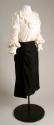 About MeBlack satin skirt with a draped effect over the hips shown with a cream silk long sleeved blouse with a double layer of frills. This outfit is typical of late 1950s style. The pencil or hobble skirt was made popular by Yves Saint Laurent at Dior about 1959. Although the skirt is narrower around the hem, by comparison to the large crinoline-style skirts also popular at the time, it still maintains a fashionable feminine shape, emphasising the hips and small waist with flaring around the top of the skirt.