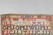What makes this sampler distinctively Scottish are the rows of initials of the family members and parents of the embroiderer. In Scotland, unlike in England, a woman kept her maiden name after she married and this accounts for the range of capital letters in the stitched rows.