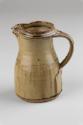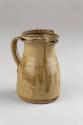 About MeStoneware small jug with almost straight sided body. Pulled and flattened double rim with wide lip. Strap handle pulled from below the rim and terminating mid body.