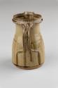 Glazed all over in a pale green ash glaze over a mid-brown glaze, possibly manganese, which shows through the ash glaze, giving a speckled appearance. Dark khaki green celadon glaze is brushed over the ash glaze, pooling around the rim and handle.