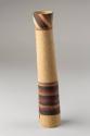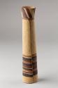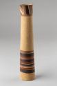About MeThis ceramic vessel has a tall elegant shape and is decorated with brown, reddish brown and black stripes. The clay has been wrapped around leaving a neat seam on the reverse.