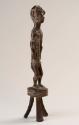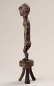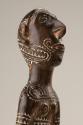 About MeWilliam MacGregor spent much of his career in the southern hemisphere. The wooden shield comes from the Trobriand Islands, Papua New Guinea, and dates from 1850-1858. Unique to the island, the shield is painted with images of birds and serpents in red, white and black paint. The two wooden carved figures – a male figure and a female figure – also come from the Trobriand Islands. The male figure, dates from 1899 and is seated on a stool with one arm touching his neck. Geometric patterns filled with lime, have been carved into the statue, extending down his back and onto the stool. The female figurine is made from polished wood dates from 1850-1899 and is decorated with zigzag, wavy and spiral carvings filled with lime. The statue stands upright on a stool and has a large domed head, a long pointed nose and scrollwork eyes.