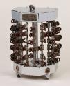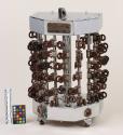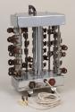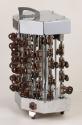 This machine dates from sometime after 1948 and was used to create a permanent wave, or perm, on ladies' hair. The heat clamps would be warmed up on the heating rods and then clamped to the hair wound around Bakelite cylinders.