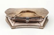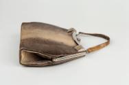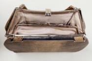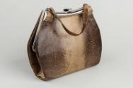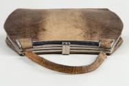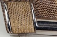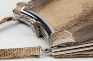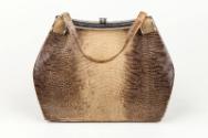 About MeSnakeskin handbag with silver metal mounts and central clip fastener. There is also a narrow snakeskin handle attached to mount by metal loops. The inside of the bag is lined with beige silk and there is an inner purse with a metal twist clip.More About Me