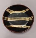 The decoration was created using trailed white slip on wet black slip and comprises three stripes across the centre and two stripes on either side. This dish has a galena (lead) glaze.