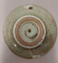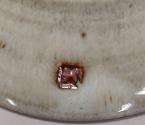 About MeSmall circular stoneware plate or dish with light green wood ash glaze and splashes of iron brown tenmoku glaze. The pieces is decorated in a white slip with a ribbon wave within three bands.