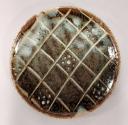 About MeThis small plate is glazed in a red-brown iron glaze and a mottled pale blue and brown wood ash glaze through which an off-white slip has been trailed in a criss-cross pattern to create squares, some of which have dots of slip glaze.