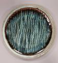 About MeOne of a set of six side plates glazed in a blue "Dalemain" ash with bands of trailed and feather combed white slip.