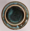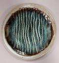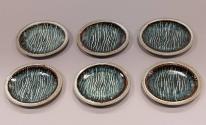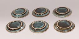About MeOne of a set of six side plates glazed in a blue "Dalemain" ash with bands of trailed and feather combed white slip.
