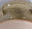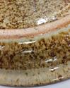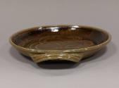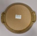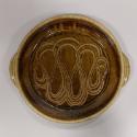 About MeLarge stoneware circular dish with two loop handles and rolled rim. It is glazed all over in a green-brown celadon-type wood ash glaze and decorated by combing through a liquid pinkish-brown iron slip in a series of swirling loops.