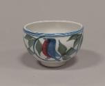 This white stoneware bowl is decorated with robins, each deftly painted with four brushstrokes.