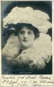 About MePhotographic portrait card showing a head and shoulders photograph of a women wearing a large wide brimmed white hat and a large white frill or collar framing her face. She wears her hair up and looks at the camera. Printed inscription: MISS JULIE OPPHandwritten inscription: Received your Hand. Painted P. P. Card and I am still drinking the Dundee Water.