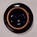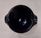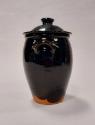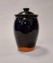 About MeThis large terracotta jar with two handles has a cover with a circular knop. It is decorated with black glaze and is unglazed around the base. The cobalt content of the glaze has created some blue visible under the black.