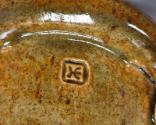 It is glazed all over with a green-yellow wood ash glaze then decorated in a swirling wave pattern by 'finger wiping' through reddish-brown tenmoku slip and a final firing of mottled wood ash glaze.