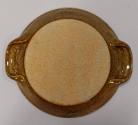 About MeStoneware press-moulded pie dish with rounded rim and two applied ribbed loop handles.