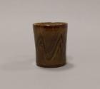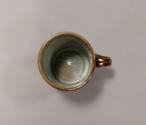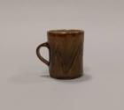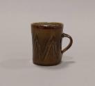 About MeThis small stoneware mug has a slightly slightly waisted form with a short strap handle. It glazed all over in a kakhi green glaze which has been combed through in a zig-zag trail revealing a reddish brown tenmoku glaze beneath.