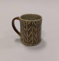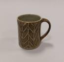 About MeThis stoneware mug has been glazed all over in a grey-white ash glaze. On the exterior an olive green glaze has been applied and wiped through to create a pattern which resembles pine needles or pine trees.
