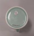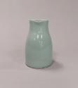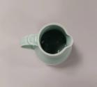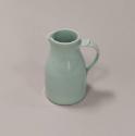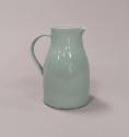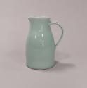 About MePorcelain jug with tapering body and short neck and lip. Simple strap handle with thumb piece. There are distinct potting rings inside the jug and a smooth exterior.It is glazed all over in a pale blue celadon glaze, pooling to the foot of the jug and becoming almost pearl white in colour around rim and handle edges.