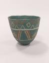 About MeThis green beaker-shaped moulded bowl is decorated with red and yellow clay laid in stripes and triangles to create a geometric pattern.