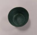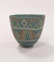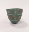 About MeThis green beaker-shaped moulded bowl is decorated with red and yellow clay laid in stripes and triangles to create a geometric pattern.