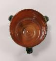 The outside is glazed in a thick dark green and irridescent purple lustre glaze. Inside the glaze is clear, revealing the orange-red earthenware body.