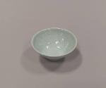 About MePorcelain small flared bowl which is glazed all over in a pale blue celadon glaze. The outside is plain, whilst the inside is decorated with a broad band of lightly incised stylised leaf pattern beneath the celadon glaze.