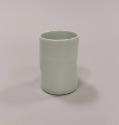 About MePorcelain cylindrical mug with small loop handle and squashed sides which appear to have been created with potter's thumb and forefinger pushing the clay inwards before firing. Distinct potting rings inside.