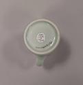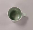 It is glazed all over in a pale green celadon glaze which is very light in colour, almost white, over the rim and handle edges and a deeper shade of green inside and towards the foot.
