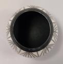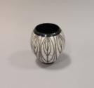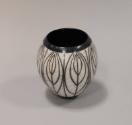 It is decorated with a resist pattern of 8 panels which contrast sharp, precise, lines with the softer curving shape of the piece. Each panel has a linear flower bud motif in black against an off-white ground which has been burnished to create a smooth finish. There are bands of burnished black to the the foot and rim.