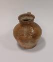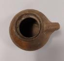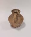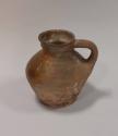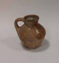 About MeEarthenware round bellied jug with prominent shoulders, collared neck and everted rim. Angular handle springing from shoulder to neck. Quite roughly potted with uneven rim and base.Partially glazed in a mustard slip - mainly opposite the handle. Most of the glaze is missing, or possibly was never applied.