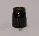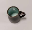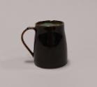 About MePorcelain mug shaped with a slightly tapering body with a short neck and plain strap handle with thumbpiece.It is glazed outside in a dark treacle brown tenmoku glaze, with rust iron tenmoku highlighting the rim and and edges of the handle. The inside is glazed in a pale blue-green celadon glaze with a band of tenmoku around inner rim becoming mottled as it merges into the celadon.