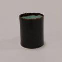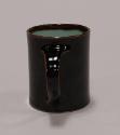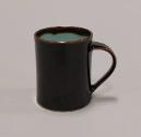 About MePorcelain mug shaped with an almost straight body, rolled rim and plain loop handle. Exterior glazed in a dark treacle brown tenmoku glaze, with rust iron tenmoku band highlighting the rim and and edges of the handle. The inside is glazed in a pale blue-green celadon glaze with a band of tenmoku around the inner rim, becoming mottled as it merges into the celadon.