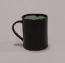 About MePorcelain mug shaped with an almost straight body, rolled rim and plain loop handle. Exterior glazed in a dark treacle brown tenmoku glaze, with rust iron tenmoku band highlighting the rim and and edges of the handle. The inside is glazed in a pale blue-green celadon glaze with a band of tenmoku around the inner rim, becoming mottled as it merges into the celadon.