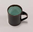 Exterior glazed in a dark treacle brown tenmoku glaze, with rust iron tenmoku band highlighting the rim and and edges of the handle. The inside is glazed in a pale blue-green celadon glaze with a band of tenmoku around the inner rim, becoming mottled as it merges into the celadon.
