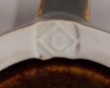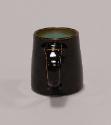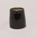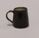 About MePorcelain espresso mug or cup shaped as a miniature tankard with slightly sloping body, narrowing towards the folded rim. Plain strap handle with thumbpiece.It is glazed outside in a dark treacle brown tenmoku glaze, whilst inside it is glazed in a pale green-blue celadon glaze with a light band of tenmoku around the inner rim which merges into the celadon.