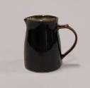 About MePorcelain jug shaped with a slightly flared body, short neck, 'beaked' lip and rolled rim. Plain loop handle with thumbpiece. It is glazed outside in a dark treacle brown tenmoku glaze, whilst inside it is glazed in a pale green-blue celadon glaze with a light band of tenmoku around the inner rim which merges into the celadon.