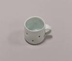 About MeLimoges porcelain espresso cup of irregular cylindrical form with small loop handle. Glazed in a very pale blue celadon crackle glaze with a pattern of meandering impressed dots highlighted in green copper around the exterior.