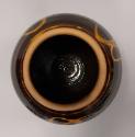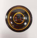 Both pieces are wood-fired and glazed in dark brown slip (liquid clay) over yellow honey glaze with a free flowing decoration of hand-painted splashed loops of yellow slip applied on three areas of the body. There is also a double band of yellow slip around neck and towards foot. The cover is similarly decorated with dark brown glaze and three concentric circles of yellow banding. The interior of jar and inside cover are both glazed in a mottled dark brown and yellow glaze.