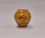 The jar and cover are wood-fired and glazed in a honey gold slip over brown glaze with finger-combed and sgraffito (scratched) decoration. The jar is divided into three panels, one decorated with a fish, one decorated with a leafy plant and the final one decorated with a prawn - motifs which appear frequently in Bowen's work.