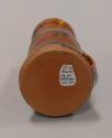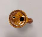 It was thrown on a wheel, wood-fired and then decorated in the tradition of English slipware using a palette of yellow ochres, orange and black. It is decorated with five bands of black slip around the foot and a freehand design of trailed green slip and iron slip on the body.