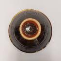 The bowl is glazed inside in a creamy-yellow slip with a narrow free-flowing band of slip-trailed brown glaze, which is repeated along the rim edge. The outside is glazed in a dark brown slip with a band of yellow slip, mixed with green, around the rim border.