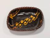 The interior and rim are glazed in very dark brown slip over honey yellow and decorated with a slip trailed honey yellow glaze applied as double curling bands across the centre and splashes in the two opposite corners.