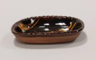The interior and rim are glazed in very dark brown slip over honey yellow and decorated with a slip trailed honey yellow glaze applied as double curling bands across the centre and splashes in the two opposite corners.